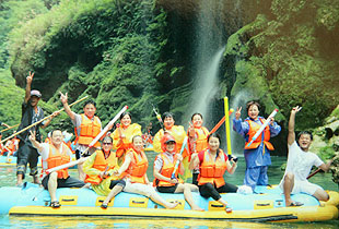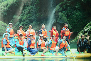 與天斗,其樂(lè)無(wú)窮;與地斗,其樂(lè)無(wú)窮;與水斗,更是其樂(lè)無(wú)窮。炙陽(yáng)高照,伙伴們對(duì)水的渴望更加強(qiáng)烈,浩浩蕩蕩前往素有“天下第一漂”美譽(yù)的猛洞河漂流,感受與水搏斗的激情和清涼。大家搶購(gòu)著水槍、水瓢、雨衣等打水仗的“武器”,懷著渴望刺激挑戰(zhàn)驚險(xiǎn)的心情互相“挑釁”,只見(jiàn)河中水花飛舞、水柱橫飛,還未等上船伙伴們就紛紛“濕身”了。拐一百五十五個(gè)彎,在一百三十三個(gè)灘潭中穿梭而行,兩岸怪石嶙峋,野猴出沒(méi),飛瀑激流,山與水的組合,讓所有的營(yíng)銷精英大呼過(guò)癮。