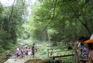 金鞭溪在張家界國(guó)家森林公園里蜿蜒流淌,因金鞭巖而得名。在“中國(guó)最美麗的大峽谷”里漫步,溪水潺潺,濃蔭蔽日,呼吸著每立方厘米中富含的8—10萬(wàn)個(gè)負(fù)氧離子,伙伴們紛紛下溪戲水,感受峽谷的靜謐和舒適。沿途游覽金鞭巖、神鷹護(hù)鞭、劈山救母等十幾處著名景點(diǎn),野猴也紛紛出來(lái)湊熱鬧,搶要伙伴們手中的食物。清澈見(jiàn)底、纖塵不染的碧水中,魚(yú)兒歡快地游動(dòng),紅、綠、白各色卵石在水中閃亮。陽(yáng)光透過(guò)林隙在水面灑落斑駁的影子,有詩(shī)贊曰:“清清流水青青山,山如畫(huà)屏人如仙,仙人若在畫(huà)中走,一步一望一重天?!?br/>